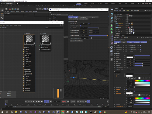 It seems increasing the Ray bounce value to max 25 solves the issue. In my previous render the bottom water layer has higher reflection value than the refraction. All other materials has same reflection/ refraction IOR but I didn't use pure white color, and added some roughness. In this test I removed all the roughness and used pure white color for refraction (for ice and bottom water used light blue color. Roughness added for the water tank only. GTX 1660 card is used for rendering. Centileo in C4d 24 and RPR (prorender) in Blender 3. I tried to match all the materials as I can, then adjusted the lighting. It seems doing a lot of trial and error Centileo can be matched to RPR. Previous renders were done with denoising on and this one without denoiser. 1920x1080 Both renders were run on 6min, no denoiser, no dof, no motion blur Centileo 2.25 iteration ray bounce 14 RPR 356 samples More test renders with dof and denoiser Centileo dof denoiser ray bounce 25 RPR with dof and denoiser I really like the ice and water renders of RPR, any idea to push Centileo to do so? Definitely Centileo can make good renders, waiting for Ambient occlusion, render pass, caustics, volumetrics etc. |